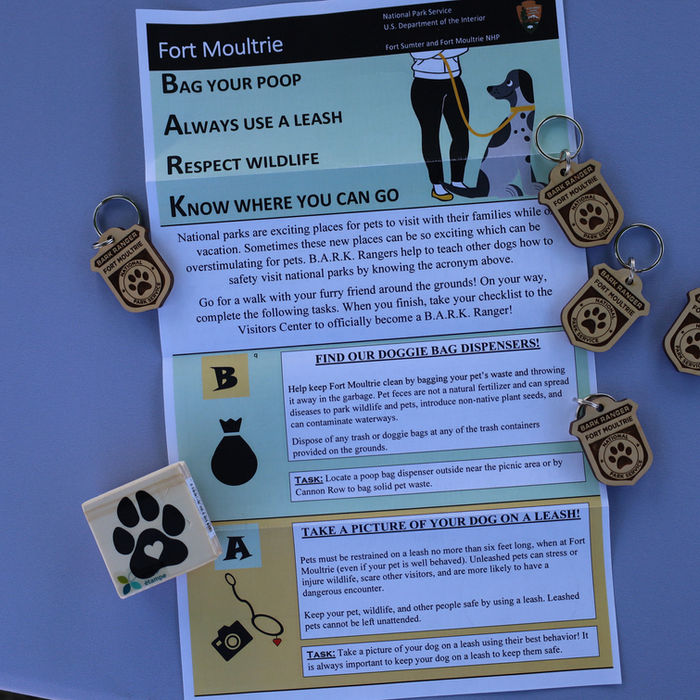 The National Park Service’s B.A.R.K. Rangers program encourages responsible pet ownership while promoting a safe, welcoming environment for pets, wildlife, and visitors alike. B.A.R.K. stands for Bag your pet’s waste, Always leash your pet, Respect wildlife, and Know where you can go. This program emphasizes these essential practices to ensure that our natural spaces remain enjoyable and safe for everyone. As part of this initiative, pet owners can bring their furry friends to the Fort Moultrie Visitor’s Center, where pets are officially “sworn in” as B.A.R.K. Rangers. Each dog receives a free collar tag, symbolizing their commitment to being a good park citizen, and owners can purchase a special B.A.R.K. Ranger bandana as a fun, stylish addition.